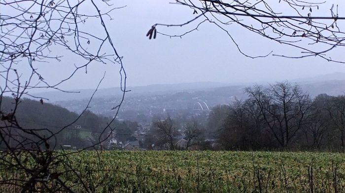 Das Wetterglück war nur beständig bis kurz nach der Mittagspause in Bassenge. Gleich beim Aufstieg aus dem Tal und während dem Übergang ins Moseltal regnete es. In den Höhenlagen war auch ein bisschen Schnee mit dabei. Hier die düstere Aussicht auf die Brücke die ich später benutzen werde um meine Reise Richtung Rheinland fortzusetzen. – The weather was only stable for a few hours. Right after my lunch break in Bassenge, as I started to climb to cross the pass over into the Mosel valley, strong rains spiked with the odd snow flurry set in. This is the view from the top, visualizing the approach to the bridge that I needed to cross in order to continue my journey towards the Rhine valley.