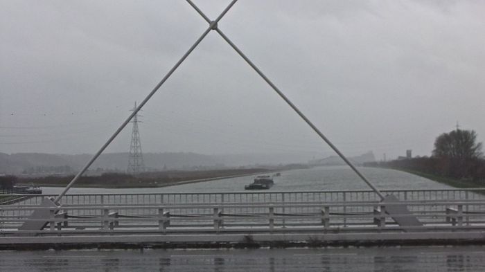Da hätte ich doch gleich noch ein paar Tage auf dem Frachtschiff fahren können: Die Reise wäre wesentlich trockener ausgefallen als zu Fuss… Hier auf der Brücke habe ich mir im peitschenden Regen überlegt ob es nicht eine Busverbindung von Visé bis zu meiner Tagesdestination gäbe! – I could have stayed a few extra days on a freighter vessel: That way the journey would have been much drier that the one on foot. At this point I was ready to look for a bus to take me to the destination of the day!