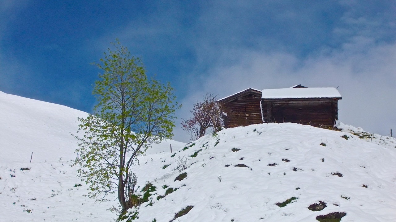 Am Rande der Heuwiesen und Getreideäcker begann das Weideland. Die Wald- und Alpweiden waren Gemeinschaftsbesitz, doch jeder Betrieb hatte eigene Stallungen und Hütten um die Milch zu gewinnen und zu verarbeiten. – The cultivated fields and meadows are surrounded by common pasture. Each family had their own barns and cabins to milk the animals and process the milk.