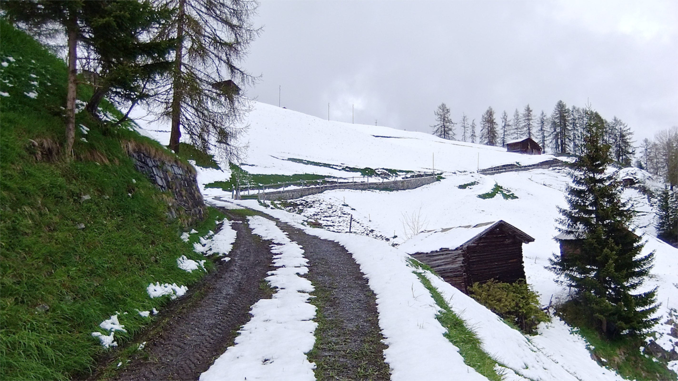 Die alte Tennerstrasse. Es ist heute schwer zu glauben dass diese während vielen Jahrzehnten die einzige Verbindung zur Aussenwelt war. Auf dieser Strasse verkehrte auch regelmäßig das Postauto und Lastwagen, was bei Gegenverkehr kritisch sein konnte. – The old access road to Tenna. It is hard to imagine that this was the only link to the outside world. This road has been used for regular post bus service and commercial traffic with heavy trucks. Meeting another vehicle was always a challenge!