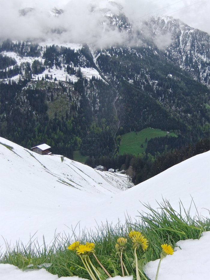 Eine steile Angelegenheit. Immer noch sichtbar und verstärkt durch den Schneefall, sind die Begrenzungen der alten Getreideackerflächen die gegen Süden ausgerichtet waren. – Steep slopes with visible evidence of the former grain growing culture of the Walser people. The grassy lines in the snowy slope indicate the property lines between the various grain fields.