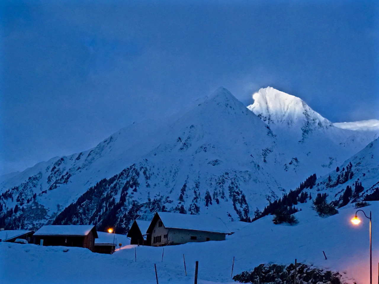 I enjoyed a short excursion on a public holiday in this exceptional pleasant winter landscape and weather. Starting point: my front door (downtown Tenna, Switzerland). Equipment: hiking boots. Trail mix: Cranberries (juicy) and Blueberries (dried) – both on the vine. Destination: “Schlüechtli” mountain, elevation 2283 m/7000 ft.