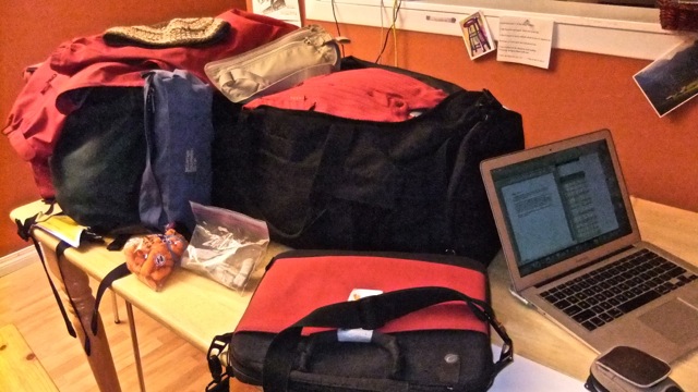 I am sitting with my black travel bag in front of me. I am checking the carry-on policies of the various airlines. The dimensions seem fine, a weight limit is not stated and I wouldn’t have a scale to check it anyhow. Later on the train and the ship, it won’t matter anymore. Good thing I am starting with the most restrictive mode of transportation.